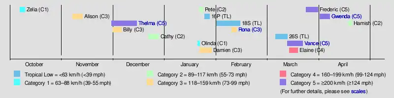 | Thelma | 3–15 Dec | Category 5 severe tropical cyclone | 220 (140) | 920 | Northern Territory, Western Australia | None | 0 | |