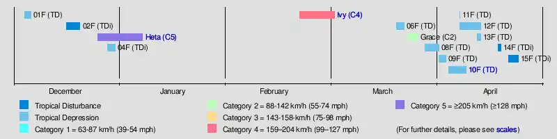 During the season at least 16 people were killed from tropical disturbances whilst overall damage was estimated at $218 million (2004 USD; $363 million 2025 USD). The most damaging tropical disturbance was Cyclone Heta which caused at least $211 million (2004 USD; $351 million 2025 USD) in damage to six different countries and left three dead.[2][3][4] The deadliest tropical disturbance of the season was Tropical Depression 10F, which was responsible for eleven deaths and caused $2.74 million (2004 USD) in damage.[5] Cyclone Ivy also caused 2 deaths and caused $4.17 million (2004 USD; $6.95 million 2025 USD) worth of damage to Vanuatu.[2][6] As a result of the impacts caused by Heta and Ivy, the names were retired from the tropical cyclone naming lists.[1]