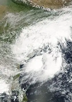 On December 10, an area of convection with an associated circulation persisted about 740 km (460 mi) west of the northern tip of Sumatra, as part of a trough in the region and enhanced by the monsoon. A steady decline in the wind shear allowed the thunderstorms to organize,[23] and a depression formed on December 11.[1] On the next day, the JTWC initiated advisories on Tropical Cyclone 03B. The storm moved generally northwestward, steered by a ridge to the north.[23] The IMD upgraded the system to a deep depression and later cyclonic storm on December 13, and further to a severe cyclonic storm a day later. The agency estimated peak winds of 100 km/h (60 mph), noting spiral convection organizing around the beginnings of an eye feature.[1] The storm also developed well-defined outflow due to an approaching trough from the west. At around 14:30 UTC on December 15, the storm made landfall near False Divi Point in southeastern India,[23] along the coast of Andhra Pradesh. After turning to the northeast over land, the system rapidly weakened, degenerating into a remnant low on December 16.[1]