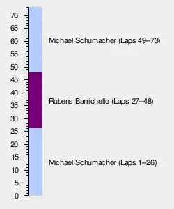 The race was a story of pit strategy, as the only passing on the circuit was of lapped traffic. Albers was the only car to run a three pit stop race, as all other drivers chose to stop only twice. The only lead changes came on lap 26, as Schumacher's 32-second stop gave Barrichello the lead, and on lap 51, as Schumacher turned in the quickest pit stop at 23.615 seconds, giving him enough time to exit pit lane at the same time as Barrichello, with the result of forcing Barrichello into the grass of Turn One. After this incident, which was not investigated by race officials, both Ferrari drivers were reminded over their radios not to crash out of the race, and they both settled into a slower pace, comfortably ahead of the rest of the field.[28] Schumacher ended up with the victory his 84th career win and 4th win overall in the US Grand Prix and the 3rd consecutive win in this event. He finished 1.522 seconds ahead of second-placed Barrichello. Monteiro and Karthikeyan finished 3rd and 4th respectively, more than a lap down. The Minardis of Albers and Friesacher were fifth and sixth, two laps behind the race winner.[36][37] All four of the drivers for Jordan and Minardi scored their first points in Formula One at this race.[37] Karthikeyan's points were the first and only for an Indian driver in Formula One.[38] This was also the final race at which the Minardi team tallied points and the only where Albers and Friesacher scored points.[39]