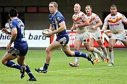 In their round four match, in which Lima made his return from suspension, a spirited Salford City Reds effort in the first half kept the visiting Wigan side to a six-point lead at half-time, but three-second half tries allowed the Warriors to pull away and put the World Club Challenge defeat behind them.[39][40] The team maintained their unbeaten start to the league campaign with a late fightback against Hull FC, despite Joel Tomkins being sent off and a last minute penalty to Hull which would have tied the game had it been scored, but Danny Tickle missed with his attempt.[41] The Tomkins brothers, Joel and Sam, both received match bans, two and one respectively, a decision which was upheld by the RFL following an appeal on Joel's ban.[42][43] Nevertheless, Wigan defeated Huddersfield Giants with a comfortable 6–20 win despite also missing Paul Deacon, Pat Richards and Fielden in addition to the Tomkins.[44] Pre-season signing Brett Finch made a try-scoring debut for the club, and Sam Tomkins returned from suspension to take on Warrington Wolves at the DW Stadium, but the last unbeaten start of Super League XVI fell as Wigan were easily beaten 6–24 by the visiting side.[45]