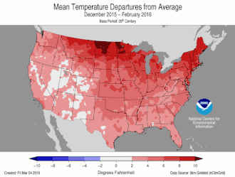 - ^ a b c d e "Lower 48 States Just Experienced Warmest Winter On Record". The Weather Channel. March 8, 2016. Retrieved March 27, 2016.