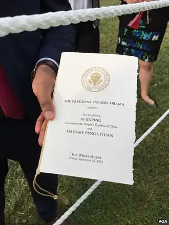- ^ "State Dinner for Xi Jinping Has High-Tech Flavor". The New York Times. September 25, 2015.
