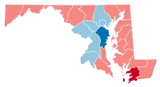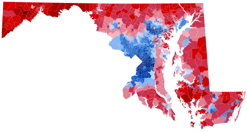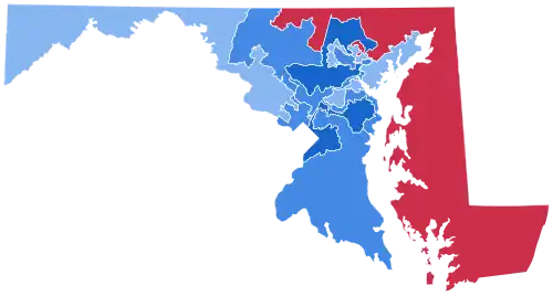 Clinton won Maryland with 60.3% of the vote, while Trump received 33.9%.[3] Maryland was among the eleven states (and the District of Columbia) in which Clinton improved on Barack Obama's 2012 raw vote total, although by just 84 votes.[4] Maryland was one of four states in which Clinton received over 60% of the vote, the others being Massachusetts, Hawaii, and California. However, Maryland was the only one of those eleven states to have voted more Democratic in both 2012 and 2016. In this election, Maryland voted 24.32% to the left of the nation at-large.[5]