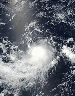 A low-pressure trough began producing disorganized convection over the waters of the Pacific Ocean, well to the south of Baja California Peninsula, on July 14.[54] Despite only marginally conducive environmental conditions, the disturbance began to show signs of organization two days later,[55] and it attained tropical depression status by 06:00 UTC on July 17.[56] Strong west-northwesterly wind shear confined the storm's intermittent bursts of convection well to the southwest of its low-level circulation, and the depression consequently failed to produce winds above 35 mph (55 km/h).[57] The system's center later degenerated into a low-pressure trough within the Intertropical Convergence Zone, prompting the NHC to discontinue advisories at 21:00 UTC on July 20.[58]