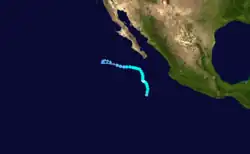 On July 28, the NHC noted the possibility of an area of low pressure well south of Mexico developing over subsequent days.[89] An area of disorganized showers and thunderstorms associated with a tropical wave materialized three days later, but little change occurred thereafter.[90] Early on August 3, a surface circulation formed in association with concentrating convection,[91] and this process led to the formation of a tropical depression by 06:00 UTC the next day.[92] The newly formed cyclone did not intensify after designation, and its low- and mid-level circulations separated by over 265 mi (425 km) on August 5 due strong easterly wind shear.[93] Falling short of the tropical storm criteria, the short-lived depression was declared a remnant low at 18:00 UTC that day.[92] The lingering vortex slowed its northwestward motion and executed a counter-clockwise loop, before dissipating completely 205 miles (330 km) southwest of the Baja California Peninsula on August 8.[92]