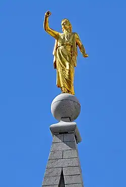 The Salt Lake Temple was undergoing a seismic upgrade at the time of the earthquake, and sustained minor damage. The Angel Moroni statue that sits atop the highest spire lost its trumpet following the earthquake. Some stones were displaced as well. The construction crews working on the seismic upgrade were sent home.[21]