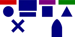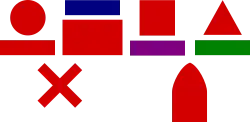 The practice of wearing battalion specific insignia (often called battle patches) in the B.E.F. began in mid 1915 with the arrival of units of Kitchener's Armies and was widespread after the Somme Battles of 1916.[13] The patches shown were worn by the division during 1917 and 1918.[14] There was an overall division scheme for the battle patches, colours for each brigade and shapes for each battalion.[15] This division also identified the companies within each battalion with an oblong coloured red for A company, dark blue for B Coy, purple for C Coy and green for D Coy, which could be worn above or below the battalion patch, as shown below. The patches were worn on both sleeves.[16]