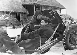 In addition to serving in the Red Army, 53-K guns were also supplied to Republican Spain and were used by the International Brigades in the British Anti-tank Battery of the XV Brigade, who served from the Battle of Brunete onwards. Richard Baxell notes that the gun in Spain "was effective against even heavy tanks at distances of up to three kilometers."[3] The guns also saw service in first stage of the German-Soviet War, but their anti-armor capabilities allowed them to fight successfully only with German light tanks and armored personnel carriers. Early models of the Panzer III and Panzer IV could also be knocked out at close range, but this put Soviet artillerymen in greater danger. Due to these circumstances, model 1937 guns were replaced with an all-new design, the more powerful model 1942. The mass production of outdated model 1937 guns was stopped in 1943. The total number of guns produced was 37,354. The German designation for captured M1937 guns was the 4.5 cm Pak 184/1(r).[4]