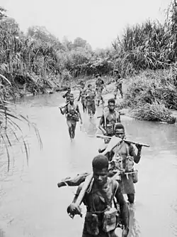At the start of the war, New Guinea was a former German possession that had become a mandated territory administered by Australia after World War I, and Papua, which been annexed by Queensland in 1883, had been an Australian external territory since 1903. While efforts were made to raise local military forces from indigenous personnel in Papua in the early war years, this did not extend to New Guinea until late in the war.[1] The New Guinea Volunteer Rifles was raised in 1939, but consisted entirely of Australian and European expatriates.[2]