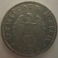 The 50 Reichspfennig coin was minted by Nazi Germany between 1939 and 1944 during World War II. It is worth 1⁄2 or .50 of a Reichsmark. Made entirely of aluminium, the 50 Reichspfennig is an emergency issue type, similar to the zinc1, 5, and 10 Reichspfennig coins from the same period.