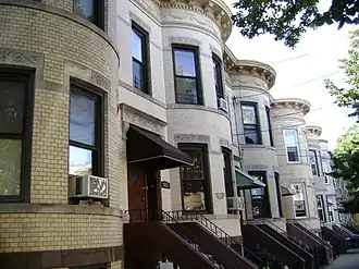 75th Avenue–61st Street Historic District is a national historic district in Glendale, Queens, New York. It includes 183 contributing buildings built between 1910 and 1925. They consist mainly of two story brick row houses with one apartment per floor. Building features include round and box front dwellings, cast stone detailing, brownstone stoops, pressed metal cornices, and covered porches.[2]