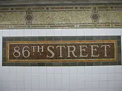 The walls along all four platforms are clad with white ceramic tiles. The ceramic tiles were installed during the early-2000s renovation and are raised about 1⁄4 inch (6.4 mm) from the original layer of tile. At the top of each wall is a colored mosaic frieze consisting mostly of yellows and browns.[5]: 4 Small "86" tablets in a circle run along this frieze.[5]: 4 [48] The name tablets have "86TH STREET" in a white serif font on a reddish-brown background with a buff-colored inner border and green outer border.[5]: 4 [49] Similar tile signs reading "DOWNTOWN TRAINS" and "UPTOWN TRAINS", accompanied by white arrows, are on the walls.[5]: 4 At the extreme southern ends of all four platforms, there are tan terracotta blocks and a darker trim line with "86TH ST" written on it in white sans serif font at regular intervals.[5]: 5