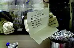 ![]() Laboratory technician holding an anthrax-laced letter sent to Senator Patrick Leahy | |