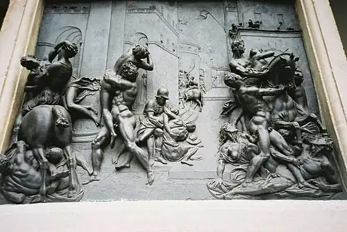 It was the first of Giambologna's statues for Francesco de’ Medici of Tuscany,[5] and is produced in the Mannerist style[6] associated with the Italian High Renaissance. It consists of three full figures and was carved from a single block of white marble. It was not given a title until after it was completed.[7] Giambologna was typically non-committal about the subject matter of his work and in this instance, wanted to produce a large, monumental sculpture that would display his virtuosity.[2] Between the time it was finished and Francesco had it installed at the Loggia dei Lanzi, Vincenzo Borghini suggested the title The Rape of the Sabines,[3] and a bronze relief was added to the pedestal to link it to the Roman myth.[4]