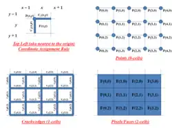 This decomposition together with a coordinate assignment rule to unambiguously assign coordinates from the image pixels to the dimensional constituents permit certain image analysis operations to be carried out on the image with elegant algorithms such as crack boundary tracing, digital straight segment subdivision, etc. One such rule maps the points, cracks, and faces to the top left coordinate of the pixel. These dimensional constituents require no explicit translation into their own data structures but may be implicitly understood and related to the 2D array which is the usual data structure representation of a digital image. This coordinate assignment rule and the renderings of each cell incident to this image is depicted in the image at right.