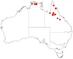 This species of Acacia is only known from areas around the Einasleigh River in central-northern Queensland, and on a sandstone plateau to the south of the Goomadeer River and at Coopers Creek near Nabarlek in the Northern Territory. It grows in rocky, sandy or shallow soils along creek banks and river flats and floodplains.[3][4]
