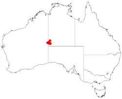 Petermann wattle is endemic to a small area near the border between Western Australia and the Northern Territory, from around Anne Range in Western Australia and between the Bloods Range and the Petermann Ranges in the Northern Territory, where it grows on quartzite scree slopes in open shrubland with spinifex, in the Central Ranges and Great Sandy Desert bioregions.[6][9]