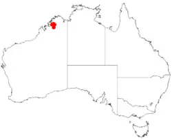 It is native to a small area in the Kimberley region of Western Australia.[1] It has a disjunct distribution between two localities, in the Packhorse Range and around Mount Agnes which is found around 80 km (50 mi) north from the Packhorse range, in the western part of the Kimberley. It is found among rocky outcrops and on plains growing in the sandstone rocks that are veined with quartzite as a part of Eucalyptus miniata woodland over spinifex communities.[2]