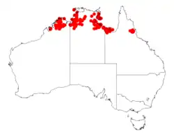 It is native to an area in the Northern Territory and the Kimberley region of Western Australia where it is commonly situated along rivers and creeks, on ridges and plains and undulating country growing in sandy, sandy-clay or loamy or stony soils over and around sandstone or laterite.[1] In Western Australia it is common around Cape Londonderry, Derby and along the Fitzroy River. It is mostly found in the north-western and north-eastern parts of the Northern Territory including many islands in the Gulf of Carpentaria with the range extending into north-western Queensland to around the Corinda area as a part of woodland, shrubland, savannah woodland or sometimes open forest communities where it is usually associated with species of Eucalyptus or Melaleuca.[2]