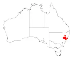 It is endemic to eastern New South Wales from around the Hunter Valley in the north to the Hunter Range in the south where it is found growing in stony sandy loams derived from sandstone soils in woodland communities.[3]