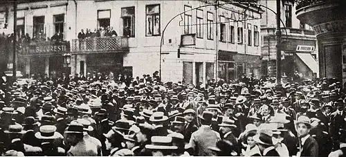 Adevărul's coverage of the international scene gave Romanians a window to political and cultural turmoil. By 1908, Adevărul was covering the burgeoning European avant-garde, offering mixed reviews to Futurism and deploring the supposed end of literary realism.[41] In late 1910, claiming to speak for "the democratic world", it celebrated the Portuguese republican revolt.[42] The efforts made for establishing and preserving international connections, Adevărul claimed, made it one of the first papers in the world to report some other events of continental importance: the 1911 food riots in Vienna, the outbreak of the First Balkan War, and the diplomatic conflict between the Greek and Bulgarian Kingdoms in the run-up to the Second Balkan War.[6] During the latter showdowns, Adevărul also employed several literary and political personalities as its correspondents: the paper's future manager Iacob Rosenthal in Sofia, Serbian journalist Pera Taletov in Belgrade, Romanian writer Argentina Monteoru in Istanbul, and Prince Albert Gjika in Cetinje.[6] In July 1913, the newspaper reported extensively on massacres committed by the Hellenic Army in Dojran, Kilkis and other settlements of Macedonia, while discussing the "terror regime" instituted in Bulgaria by Tsar Ferdinand I.[43] Later the same month, as Romania joined the anti-Bulgarian coalition and her troops entered Southern Dobruja, Adevărul gave coverage to the spread of cholera among soldiers, accusing the Conservative executive headed by Titu Maiorescu of hiding its actual toll.[44]