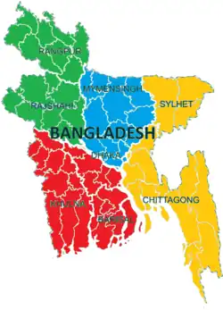| Barishal | 6 | Barguna, Barishal, Bhola, Jhalokati, Patuakhali, Pirojpur |