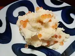 Once potatoes were harvested in the fall, the poorly shaped and small potatoes were left outside. The winter's cold would soon come and freeze the potatoes, which would thaw again in spring. This process of freezing and thawing would break down the structure of the potatoes, turning them soft. Once in that state, the potatoes were soaked in water and thawed completely. The starch that settled to the bottom of the water was collected, formed into spheres, and arranged in a warm place to ferment. This resulted in a fine textured potato flour. The flour was formed into cakes and baked in the ashes of the fire, then bear fat or cipor (salmon roe) was added and together placed in sayo to eat.[11] In modern times with the influence of ethnic Japanese culture, it became more common to flavor pocche-imo with artificial flavorings such as saccharin then deep fry them. The fried product is then eaten with nori or a mixture of sugar and soy sauce.[7]: 128