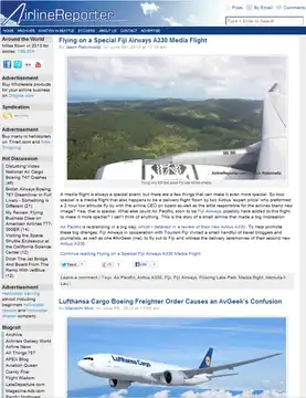 Airline Reporter is an airline industry news blog that provides industry-wide news to readers who are interested in the airline and travel industry itself.[1] Owned and operated by David Parker Brown, with writers located around the world and syndication with Reuters,[2] it has been referenced by CNN,[3] CNBC, NPR, Marker Place, FOX, AOL, Huffington Post, Forbes, APEX magazine, USA Today, KING5, MSNBC (now NBC News), Puget Sound Business Journal, Savvy Stews Network,[4] Seattle Times, Gadling, Contemporary Business,[5] The Independent and the Business Insider,[6] and many other US and international media. Since its inception in 2008, it reports news and events affecting the industry, taking advantage of new media to facilitate dialogue and interaction between airlines, aerospace companies, industry experts, and travelers.[7]