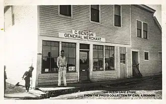 Lorne A.S. (1884–1955)[107] & Nita M. (1896–1947)[108] Lyle[102] arrived in 1917. Their four daughters raised there were Ethelwynne, Lorita, Nelda and Lois.[109] Buying a central lot south of the tracks at Mile 108.7, Lorne erected a two-storey store,[94][110] which he ran (1918–21; 1923–50), and became postmaster (1920–21; 1923–50).[95] Commonly, the postmaster in such towns was also a storeowner. Selling the store to Joseph Thomas Norquay (1874–1962),[111][112] postmaster 1922–23,[95] the Lyles travelled.[113] Following customer dissatisfaction and unpaid purchase instalments, Lyle repossessed the business in 1923.[114][115] The living quarters occupied the upper level and the rear of the lower level.[116] He constructed a wooden sidewalk out to the tracks. The later enlargement of the store complex included additional buildings for a butchery, flour and feed storage, a warehouse, woodshed, and workshop.[117] The record selection for the store's gramophone entertained customers throughout the 1920s, 1930s and 1940s.[118] Lyle acted as the unofficial mayor.[119]