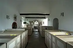The nave's north wall contains two one-light windows dating to the 16th-century, the south wall has two round-headed windows of the 18th-century, and the west wall has one round-headed window of the same date. The nave has a plastered barrel-vaulted roof. The chancel's east window is 14th-century, the south wall has two 18th-century windows and the north wall contains a blocked lancet of 13th-century date. The chancel's roof has two moulded tie-beams dating to the 16th-century and an 18th-century barrel-vault ceiling. The chancel arch, shaped like a Palladian window, was remodelled in the 18th-century.[4] It has an elliptical arch and Tuscan columns.[2]