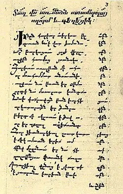 According to Theo van Lint, poets starting from the 13th century wrote in genres that were freed from various poetic forms existing in the church.[86] The range of topics they covered expanded.[132] Gradually, religious tendencies receded into the background,[11] and love poetry flourished.[10] P. Cow divided it into two categories: those that praise the physical qualities of the beloved woman (praise) and those that tell of unrequited love (lament).[133] Cultural trends of the time were often influenced by political, economic, and military events.[9] Despite the difficult conditions of the 13th to 16th centuries, thanks to cultural and educational centers both in Armenia and in the Diaspora, the accumulated intellectual heritage was preserved. New monuments of poetry were created, and the developing translated literature continued to enrich the national literature.[11] In monasteries, students were taught to compose poetic works. Special "dictionaries" were compiled for use in poetry.[128] Collections of poems called "Tagharan" were also written there.[134] An important event in cultural life was the emergence of Armenian printing in Venice in 1512. Literature became even closer to life. Middle Armenian became the dominant literary language instead of the endangered classical grabar. The proportion of poetic speech increased, as did its social and ideological significance in literature. Becoming the heritage of the masses, lyricism became even closer to folklore, finding common ways of connection with folk songs, their way of thinking, and character creation. The commonly used poetic forms were praise, lament, exhortation, lamentation, nativity, and kapkh, which discussed themes of love, nature, social status, wandering, and morality. In these works, the sorrow of the people, personalities, patriotic feelings, and philosophical reflections on the social situation, death, soul, and body were expressed. Numerous epic, epic-lyrical, and didactic poems were created, dedicated to heroic periods or individual characters throughout the history of Armenia.[11] According to K. Bardakchyan, "both in allegorical poems and in patriotic works of the past, there was a certain hope for revival".[81] Poetic developments based on themes from the Sacred Book were made, as well as artistic descriptions of various scientific issues.[11]