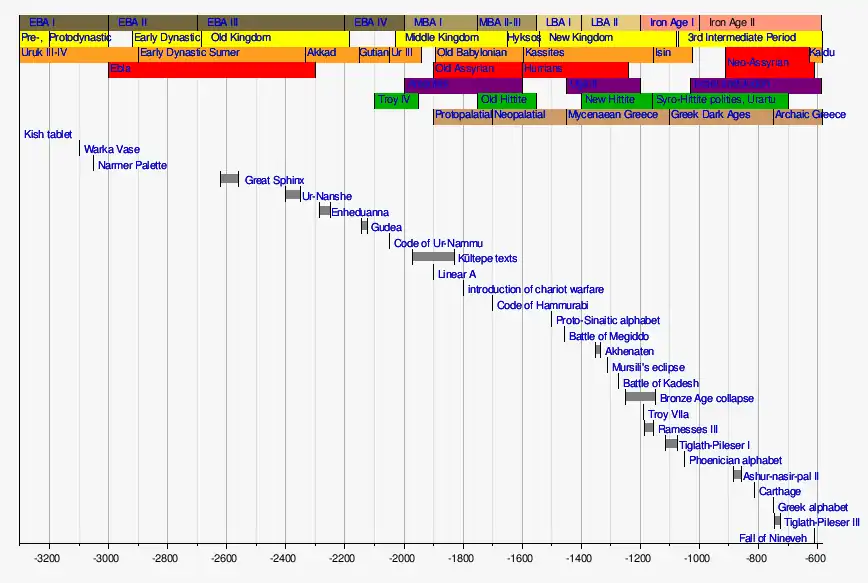The Bronze Age collapse is the name given by those historians who see the transition from the late Bronze Age to the Early Iron Age as violent, sudden and culturally disruptive, expressed by the collapse of palace economies of the Aegean and Anatolia, which were replaced after a hiatus by the isolated village cultures of the Dark Age period in history of the ancient Middle East. Some have gone so far as to call the catalyst that ended the Bronze Age a "catastrophe".[19] The Bronze Age collapse may be seen in the context of a technological history that saw the slow, comparatively continuous spread of iron-working technology in the region, beginning with precocious iron-working in what is now Romania in the 13th and 12th centuries.[20] The cultural collapse of the Mycenaean kingdoms, the Hittite Empire in Anatolia and Syria, and the Egyptian Empire in Syria and Palestine, the scission of long-distance trade contacts and sudden eclipse of literacy occurred between 1206 and 1150 BC. In the first phase of this period, almost every city between Troy and Gaza was violently destroyed, and often left unoccupied thereafter (for example, Hattusas, Mycenae, Ugarit). The gradual end of the Dark Age that ensued saw the rise of settled Neo-Hittite and Aramaean kingdoms of the mid-10th century BC, and the rise of the Neo-Assyrian Empire.