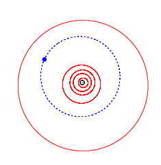 Orbit comparison of 9991 Anežka (blue), inner planets (red) and Jupiter (outermost)