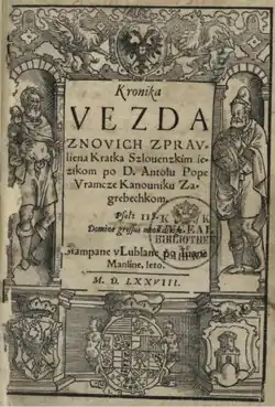The first work by Vramec was a world chronicle titled Kronika vezda znovich zpravliena Kratka Szlouenzkim iezikom, published in Ljubljana (Laibach) in 1578.[5] This was the first popular historical work written in a South Slavic vernacular in the Habsburg lands.[6] In 1586 in Varaždin Vramec published a book of sermons and comments titled Postilla po nedelne i po godovne dni na vse leto vezda znovič spravlena po Antonu Vramcu Svetoga pisma doktoru i cirkve varaždinske plebanušu. Both books were printed by Joannes Manlius.[1] To suppress liturgical books published by the Protestant Reformation Vramec deliberately used simple language spoken by the population of Slavonia in his works .[7] It is possible that Vramec's Postilla was published in 1586 in Varaždin to follow the orders of Juraj Drašković, the bishop of the Roman Catholic Archdiocese of Zagreb, who ordered publishing of new books to dispute writings of Mihajlo Bučić.[8]