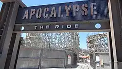 In late 2010 following a post-bankruptcy restructuring, Six Flags announced that it would be moving away from intellectual property licensing agreements, aside from those involving DC Comics, Hanna-Barbera and Looney Tunes. The initiative involved rebranding Terminator Salvation: The Ride to a more generic theme as a cost-saving measure.[1] On January 8, 2011, the roller coaster began operating as Apocalypse the Ride.[1] Terminator animatronics and themes were removed from the queue, the ride received new signage, and new video was created for the preshow room. The updated storyline centers around survivors of a global war taking refuge in a bunker, with the coaster offering a way to get there.[1][4] Apocalypse retained the existing pyrotechnic and fog effects featured under the previous theme.[1]