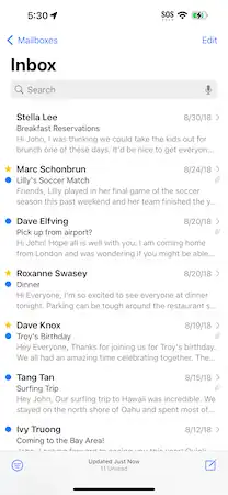 Mail has been updated to include features from popular competitors, such as allowing a user to undo sending an email for up to 10, 20, or 30 seconds, scheduling an email to be sent at a user-set time, reminding the user to follow up on an email, and notifying the user to add an attachment or recipient if they seemed to forget to do themselves. Search has been improved by using synonyms for search terms and automatically correcting typos. It also shows shared content and previous search terms when invoked. Messages you sent which haven't received a reply will also move to the top of the inbox to send a follow-up. Emails from companies now show their logo using BIMI support.[11]