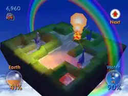 Aqua Aqua's gameplay remains largely unchanged from Wetrix (1998).[a] Described by Electronic Gaming Monthly's Chris Johnston as a combination of Tetris and Civilization, it is a 3D isometric puzzle game where the player builds paddocks on land to prevent falling water bubbles from dripping off the landscape.[6][7] The enclosures are created by dropping L-shaped, T-shaped and square pieces that raise a part of the landscape named Uppers; there are also Downers that do the opposite, decrease the height of a wall.[4][7] Fireballs help in the player's goal, in that they evaporate water, and points are earned from it depending on how much water is evaporated.[8] However, there are also hazards such as bombs that create holes on the ground, ice cubes that freeze water, rainstorms that occur in the later stages, and earthquakes triggered when a wall is too high that ruin nearly all of the architecture.[7] The amount of water dripped off the land is showcased by a meter, which the game ends once its full.[9]