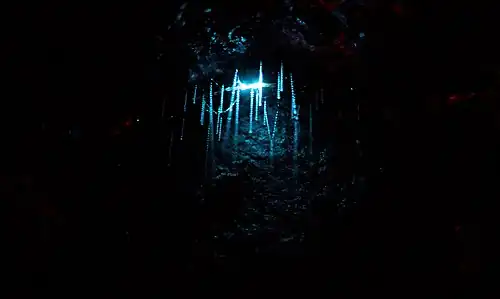 Arachnocampa luminosa (Skuse, 1891), commonly known as New Zealand glowworm or simply glowworm, is a species of fungus gnat solely endemic to New Zealand. The larval stage and the imago produce a blue-green bioluminescence.[2] The species is known to dwell in caves and on sheltered banks in the native bush where humidity is high, as moisture helps to maintain their silk structures that capture prey.[3][4] Its Māori names are pūrātoke, from the verb "to glow",[5] and titiwai, meaning "lights reflected in water."[6] This likely derives from the glowworms' presence near bodies of water,[7] where their luminous displays are reflected.