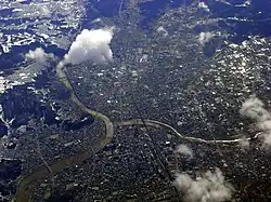 ![]() Looking southeast over the Arakawa River in Fukushima City. Fukushima Station is visible in the distance. | |