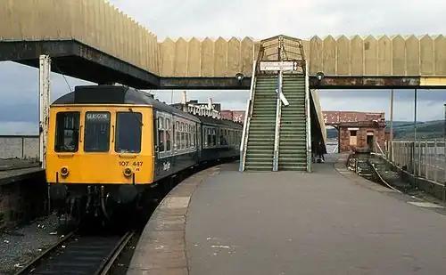 ![]() The station on 22 June 1984, with the 12.33 to Glasgow Central waiting to depart | |||||