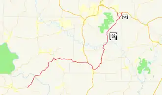 AR 58 begins at AR 14 and runs north, crossing the White River and Guion.[3] It continues north until meeting AR 69 south of Sage.[4] The route continues east to Maxville, where it meets US 167. AR 58 concurs with US 167 until Cave City, when it begins to head northeast with AR 115. After leaving the AR 115 concurrency, the route heads due north to Poughkeepsie, where it passes the Poughkeepsie School Building and Little Springs Missionary Baptist Church, both listed on the National Register of Historic Places.[5] Highway 58 serves as the eastern terminus for Highway 56. AR 58 continues north to meet AR 354 before heading to Williford. In Williford, AR 58 splits into two routes, with the alternate route being designated AR 58E. The main route continues north to terminate at US 62/US 63/US 412.[6]