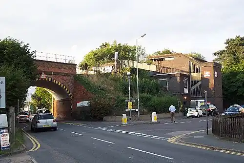 Ash Vale station is on an embankment[1]: 48 and is adjacent to the Basingstoke Canal.[2]: Fig. 1 It is around half a mile from North Camp station on the North Downs Line.[3]