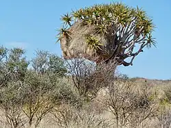 The most characteristic plant in the park is the giant tree aloe (Aloidendron dichotomum) known locally as the quiver tree or kokerboom.[8] It is perfectly adapted to the dry semi-desert rocky areas found in the Nama-Karoo, able to withstand the extreme temperatures and the infertile soil. This tree, which grows up to five metres high, gets its name from the fact that the Bushmen (San) used the soft branches to make quivers for their arrows. The eye-catching silhouette of the quiver tree is typical of this part of Northern Cape landscape. When the tree flowers in the winter flocks of birds are attracted to their copious nectar, and baboons can be seen tearing the flowers apart to get the sweet liquor.