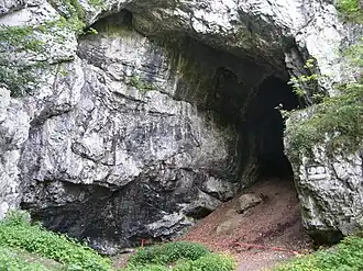 Býčí skála Cave (Czech: Býčí skála, German: Stierfelsen, English: The Bull Rock Cave) is part of the second longest cave system in Moravia, Czech Republic. It is also famous for archaeological discoveries. Except for the entrance, the cave is not accessible to the public, although occasionally it is opened for visitors.