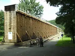 As of 1708, Kreuznach wholly belonged to Electoral Palatinate. Under Elector Palatine Karl III Philipp, the Karlshalle Saltworks were built in 1729. Built in 1743 by Prince-Elector, Count Palatine and Duke Karl Theodor were the Theodorshalle Saltworks. On 13 May 1725, after a cloudburst and hailstorm, Kreuznach was stricken by an extreme flood in which 31 people lost their lives, some 300 or 400 head of cattle drowned, two houses were utterly destroyed and many damaged and remaining parts of the town wall fell in.[48] Taking part at the founding of the Masonic Lodge Zum wiedererbauten Tempel der Bruderliebe ("To the Rebuilt Temple of Brotherly Love") in Worms in 1781 were also Freemasons from Kreuznach. As early as 1775, the Grand Lodge of the Rhenish Masonic Lodges (8th Provincial Grand Lodge) of Strict Observance had already been given the name "Kreuznach".[49] In the extreme winter of 1783/1784, the town was heavily damaged on 27–28 February 1784 by an icerun and flooding. A pharmacist named Daniel Riem was killed in his house "Zum weißen Schwan" ("At the White Swan") when it collapsed into the floodwaters.[50]