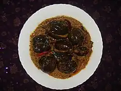 Baghāre baingan is a curry from the Hyderabadi cuisine made with eggplant (brinjal) Hyderabad, India. It is also used as a side dish with the Hyderabadi biryani.