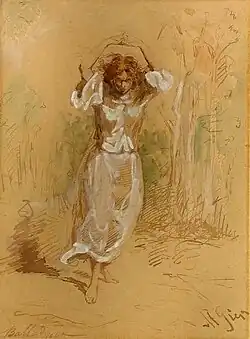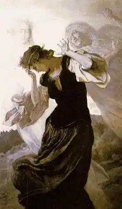 The sisters compete to marry Kirkor by collecting raspberries. When Balladyna finds out that Alina is winning, she kills her with a knife. The only witness is Grabiec, whom Goplana turns into a weeping willow to prevent him from telling anyone about the murder. After returning home, Balladyna claims that her sister ran away with a lover. The only things reminding Balladyna of the crime she committed are a bloody stain on her forehead that cannot be removed, pangs of remorse and terrible nightmares. The body of the dead girl is found by Filon, who falls in love with her.