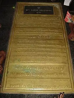 Ziegenbalg was troubled by ill health his entire life, a condition aggravated by his work in the mission field. He died on 23 February 1719, at the age of thirty-six, in Tranquebar. His last 13 years were spent laying the foundations for German scholarship in Tamil that continues to this day. Ziegenbalg is buried at the New Jerusalem Church, which he helped establish in 1718 at Tranquebar.[17][18]