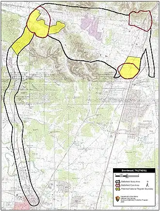 - Most of the battle took place around what is now the Shell station on the northwest corner of Franklin Road and Old Hickory Boulevard (36.038072, -86.787273).[2]